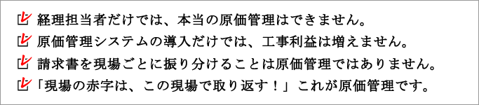 毎月の請求書を現場ごとに振り分けて、原価を集計することは経理です。原価管理は、予想して、改善して、対比することです。『現場の赤字は、この現場で取り返す!』 これが原価管理です。「次の現場で儲ければいいや・・・」そう思っているうちは、いつまでたっても儲かりません。今日の赤字は、明日にでも取り返しましょう!