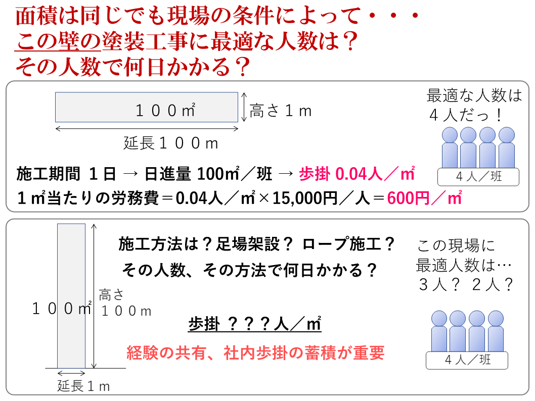 例えば、同じ面積の壁の塗装工事でも、現場によって最適な人数や日進量は違うはずです。実際の経験を歩掛として残しておけば、実行予算をつくる時に役に立ちます。