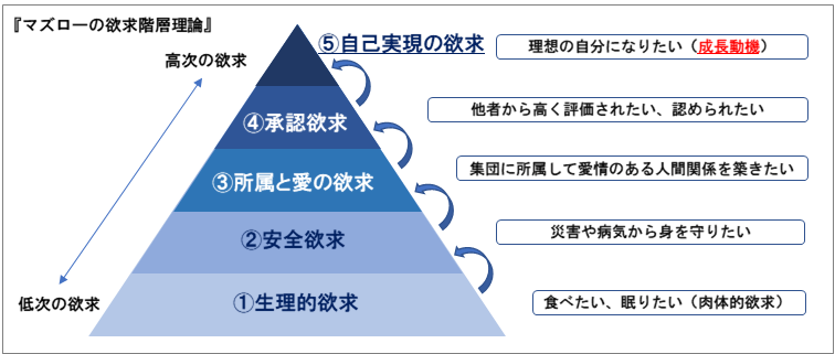 低次の欲求が満たされ、自己実現の欲求を持った社員が最もヤル気があるといえます。社員が自己の成長を望み、能力を高めようと努力すれば、当然、企業にとってもプラスになるわけです。マズローは、高次の欲求よりも低次の欲求のほうが緊急性が高いと言っています。職場において、社員の高次の欲求(自己実現の欲求)を活性化するためには、低次の欲求を満たしてあげることが必要です。